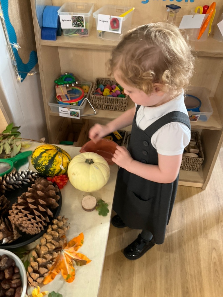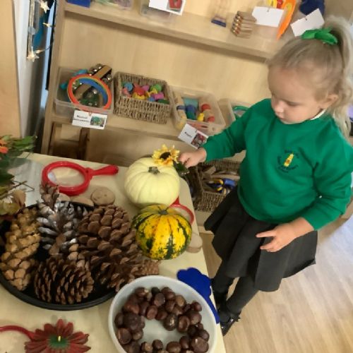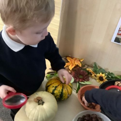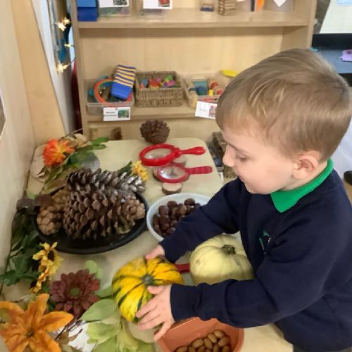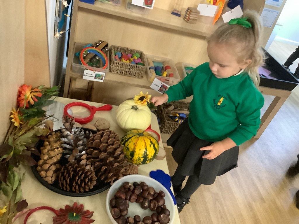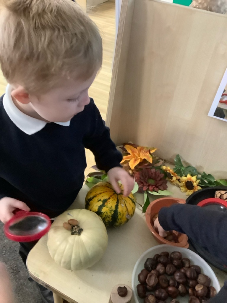 Children exploring an autumn collection of leaves, conkers, pumpkins etc.