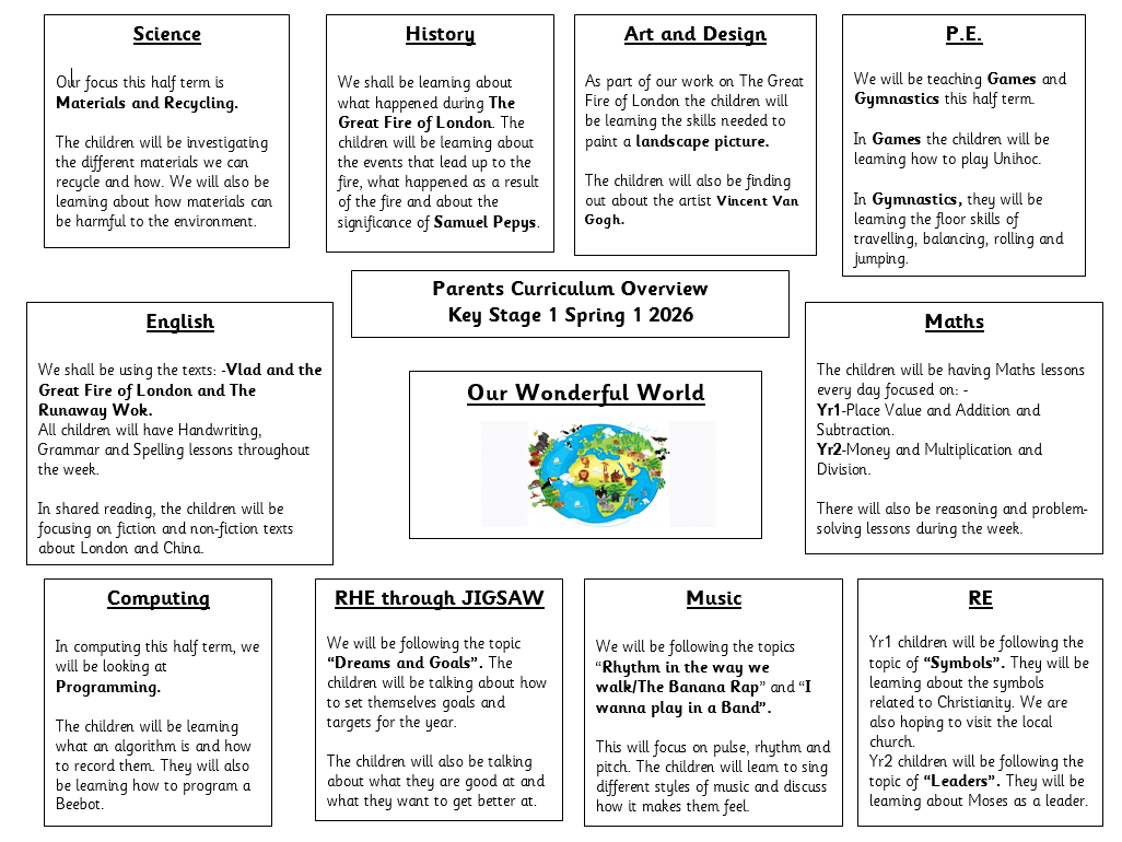 PE Days: Wednesday and every Friday (Children should come to school in their PE and remove ear-rings. (If this is not possible, please cover with a plaster or tape).